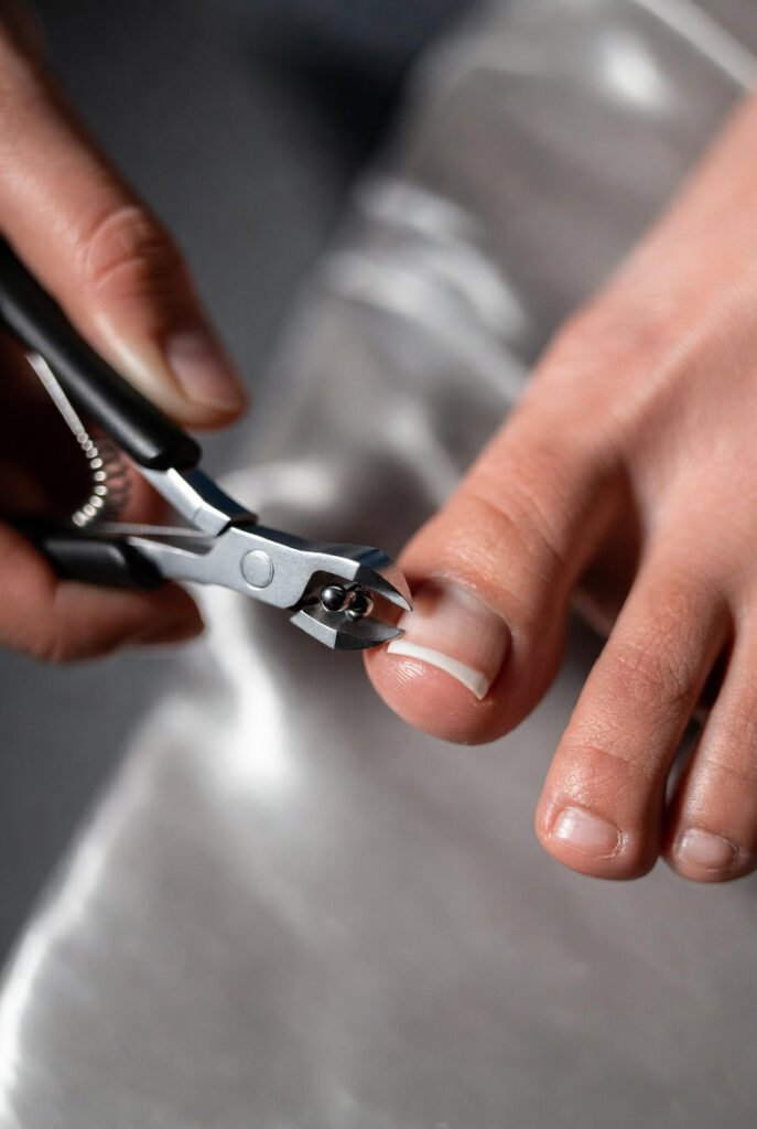 2. Das richtige Werkzeug wählen Nimm einen speziellen Nagelknipser oder eine Nagelzange für Füße – scharf und aus Edelstahl. Diese sind extra für dickere Zehennägel gemacht und schneiden sauber, ohne zu quetschen.